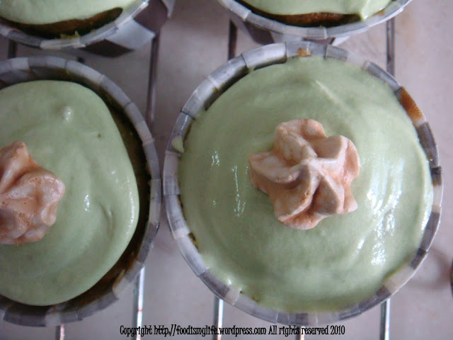 The frosting I used was a buttercream frosting and since I don’t like a too-sweet frosting, I added less icing sugar and ended up with a more watery frosting. Of course, the green tea spirit was not missed.